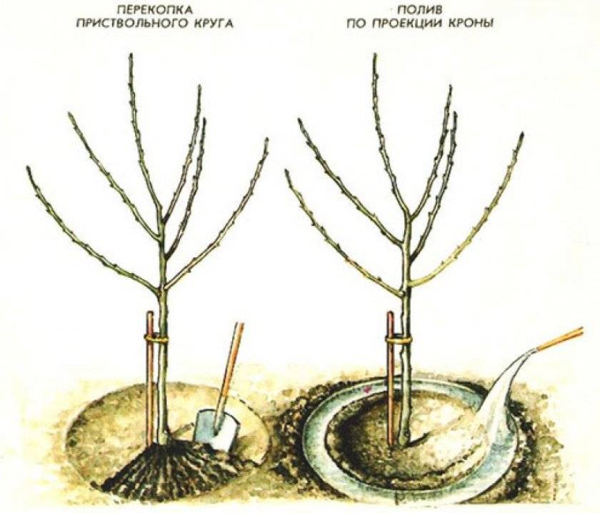Вокруг стволов взрослых яблонь перед приходом зимы проводят перекопку почвы. Перекапывание почвы делает её более рыхлой, воздухо и влагопроницаемой, одновременно процедура переносит на поверхность грунта зимующих насекомых и личинок. В последствие вредящие насекомые замерзнут с приходом морозов или же будут съедены птицами. Часто вскапывание грунта совмещают с внесением органических удобрений в прикорневой слой.