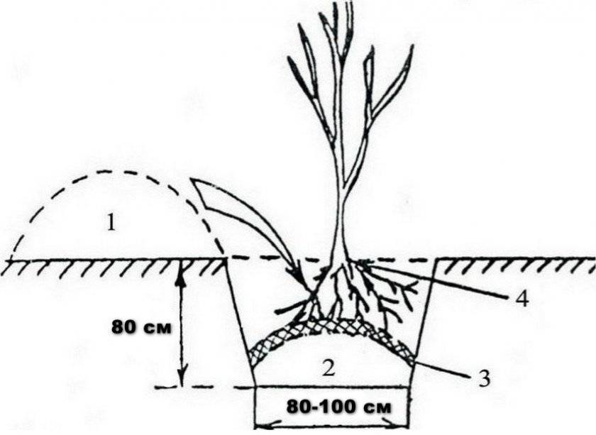 1) верхний плодородный слой почвы; 2) верхний плодородный слой почвы с добавлением перегноя и минеральных удобрений; 3) слой почвы без удобрений; 4) корневая шейка (место прехода корневой системы в ствол) Яма делается шириной 80–100 см, глубиной до 80 см и готовится за пару недель до предполагаемой даты посадки. Предпочтительно делать её с коническим возвышением посередине, вокруг которого будут расправляться корни. Яма заполняется чуть более чем наполовину плодородной землёй с включениями торфа, перегноя и минеральных удобрений. После помещения в неё саженца землю подгребают и слегка утрамбовывают вокруг ствола.