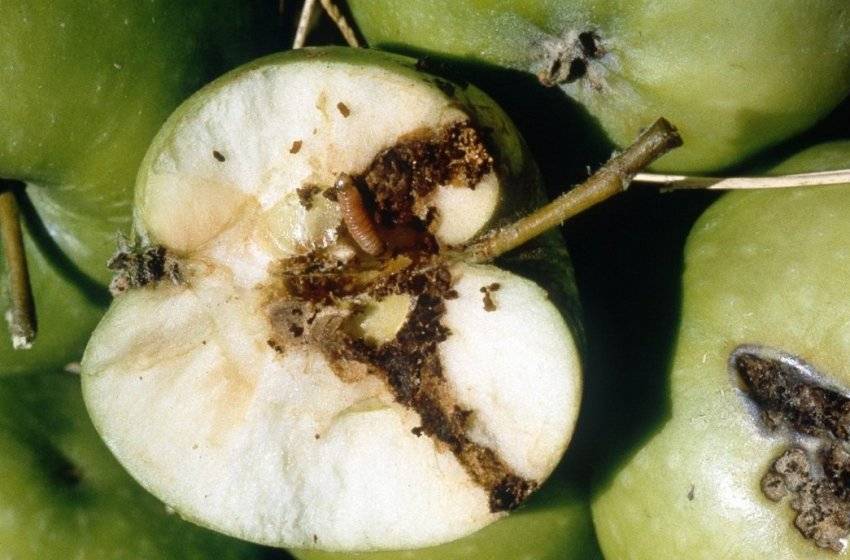 Основной вредитель яблони — плодожорка. На поверхности яблок можно заметить точки, через которые личинки попали внутрь завязи. Они развиваются внутри вместе с самим плодом. Первое опрыскивание от плодожорки выполняют сразу же после того, как отцветут яблони, а затем его повторяют несколько раз через 3 недели. Это связано с тем, что за лето образуется несколько поколений мотыльков плодожорки.