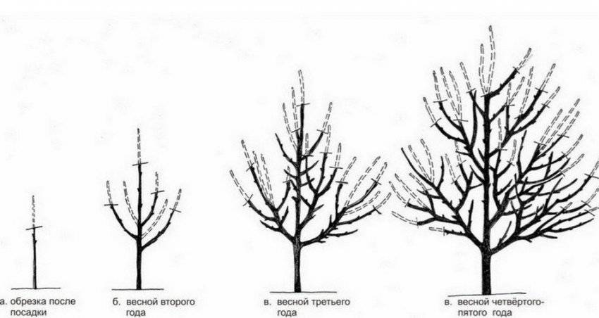 Скелетные ветви и центральный побег необходимо укоротить на 20 см таким образом, чтобы крона была пропорциональной. Третий ярус состоит из 1 ветки, которую оставляют на расстоянии 40 см от второго яруса, также проводится укорачивание основных побегов на 20 см. Формировочная обрезка длится 3 года. Дальше ежегодно необходимо проводить санитарную обрезку, которая заключается в удалении повреждённых, сухих, заражённых болезнями и вредителями побегов.