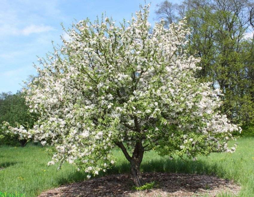 Крона у таких яблонь густая, в форме широкой пирамиды. Кора гладкая, светло-серого оттенка. В период цветения яблони очень красивы.