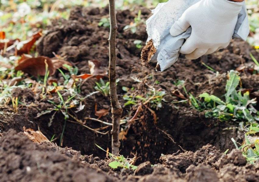 Перед высадкой любой плодовой культуры, выбранное место нужно расчистить от остатков сорняков и выращиваемых ранее растений, взрыхлить почву и при необходимости добавить в неё питательных веществ: например, 3–4 кг перепревшего навоза или 200 г суперфосфатного удобрения, в расчёте на 1 м². Размеры самой посадочной лунки должны соответствовать параметрам корневища саженца, но обычно и глубина, и ширина ямы имеют не менее 70 см.