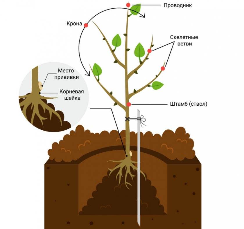 В подготовленную яму всыпают 1/3 часть смешанного грунта в виде холмика, на который ставят саженец и расправляют корни, возле него нужно вкопать крепкую опору так, чтобы не повредить корни. Сверху присыпают второй частью почвосмеси. Из третьей части делают прикорневой круг. Корневая шейка должна выступать над уровнем земли на 3-5 см.