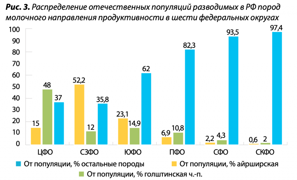 Решение обозначенных задач зависит также от производственных и воспроизводительных качеств коров. Хотя представители данной породы считаются скороспелыми, в среднем по России они уступают голштинскому скоту по возрасту первого отела на 1,3 месяца, что приводит к более поздней окупаемости затрат на выращивание особи. При этом следует отметить, что в рамках исследования в ПФО у айрширских коров возраст первого отела оказался на 0,2 месяца меньше, чем у голштинского скота. Возрастной состав изучаемых стад в среднем по стране по сравнению с широко распространенной породой был на 0,47 отела старше с колебаниями от 0,13 в ПФО до 0,54 единицы в СФО. Также более продолжительным оказался срок их продуктивного использования — на 0,71 отела с вариацией по округам: от 0,13 в Приволжье до 0,66 в Центральном регионе.