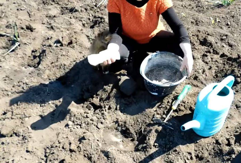 Шаг четвертый | Высыпьте приготовленную смесь из удобрений и перегноя в ямку. Аккуратно выровняйте при помощи сапки и полейте. |