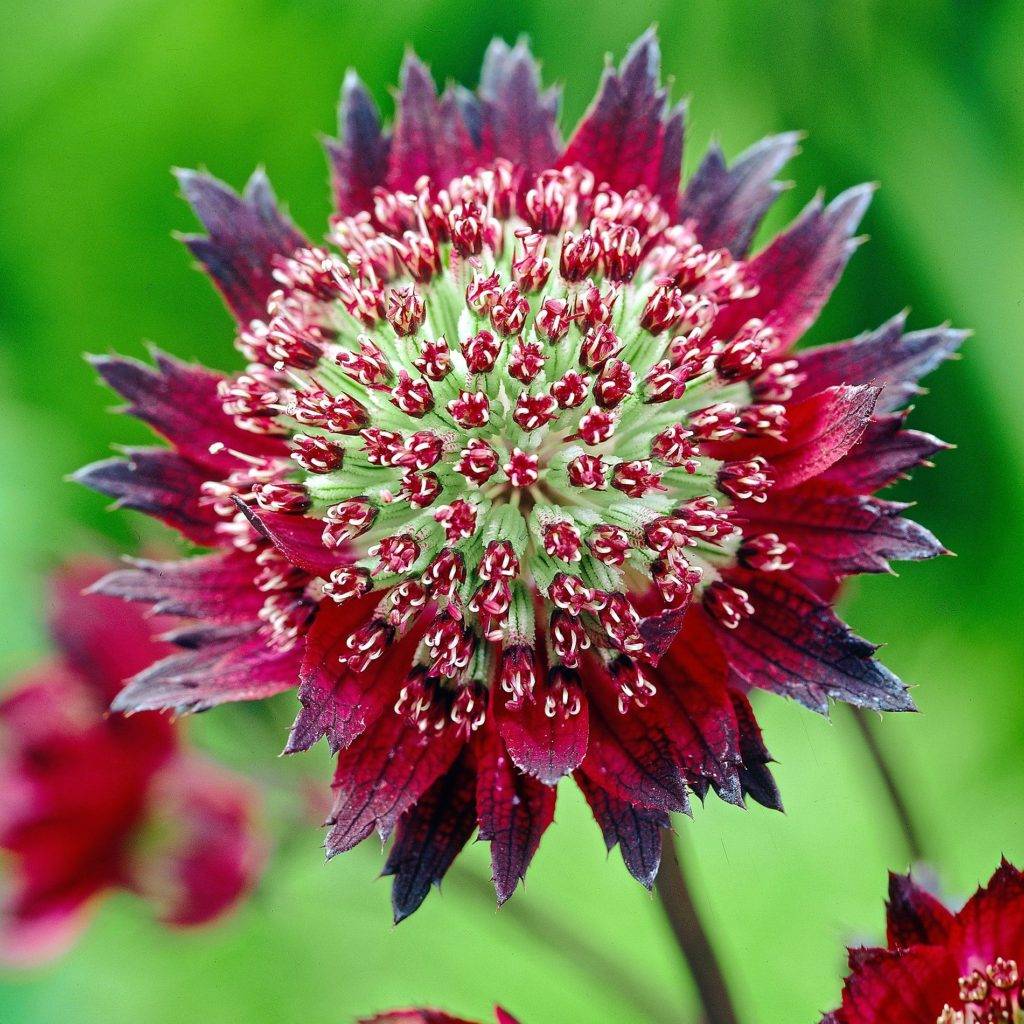 Еще один довольно оригинальный и популярный сорт крупной астранции — это Мулен Руж с темно-красными соцветиями винного оттенка, часто встречаются представители с бордовыми бутонами. Глубину оттенка подчеркивает обертка почти черного цвета в форме звезды. Предпочтительно сажать сорт астранции Мулен Руж на солнечный участок или в полутень. В тени цветение будет более скромным.
