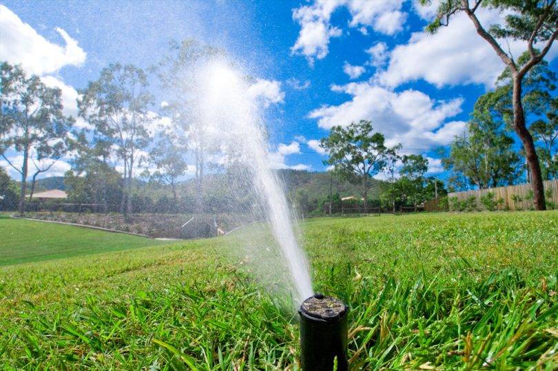 - Дождеватели (спринклеры, разбрызгиватели). По типу подачи воды на газон могут быть веерными и роторными. Веерные поливают газон, распыляя воду на 360°.