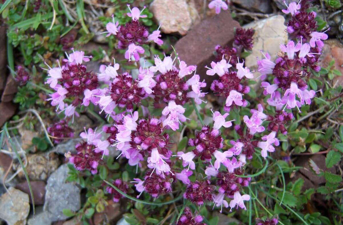Соцветия тимьяна напоминают по форме шарики. Цветовая гамма — от темно-сиреневых, почти фиолетовых, до лиловых и розовых, а пряный, густой аромат ни с чем не спутаешь. Цветение приходится на конец июня – начало августа. У чабреца есть также плоды — крошечные, в полмиллиметра величиной, орешки эллипсоидной формы.