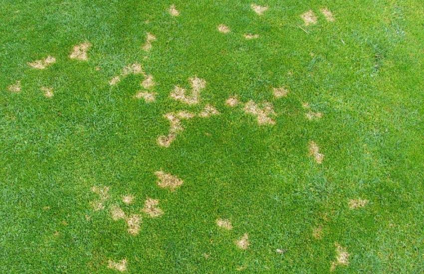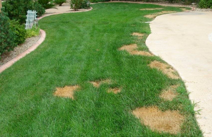 Первым признаком заболевания газона могут быть неестественные рыжеватые пятна по всей поверхности.