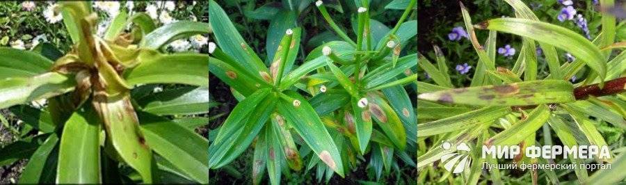 Возбудитель фузариоза лилий — гриб Fusari um oxysporum или другие представители этого рода. На поверхности подземной части стебля появляются продолговатые пятна от оранжевого до темно-коричневого цвета. Болезнь может распространиться по всему стеблю и проникнуть внутрь, тогда он загнивает и сморщивается. Листья становятся лиловыми или желтеют, растение преждевременно погибает.