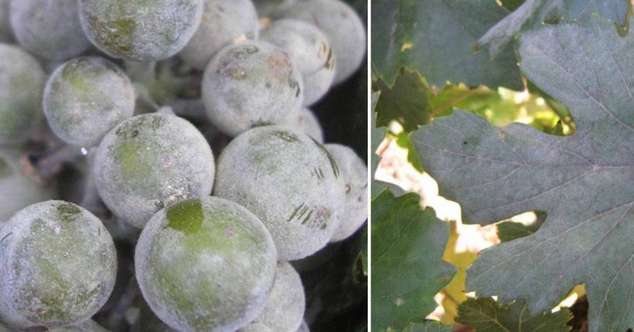 Грибковое заболевание винограда. Поражаются ягоды и зеленые части лозы. Развивается при сырой и жаркой погоде. Внешне схож с оидиумом. Чтобы их отличить, нужно пораженную часть виноградника поместить в тару, накрыть влажной тканью и поставить на пару часов во влажное место. Лист (или побег) покроется бархатистым налетом зеленого цвета.