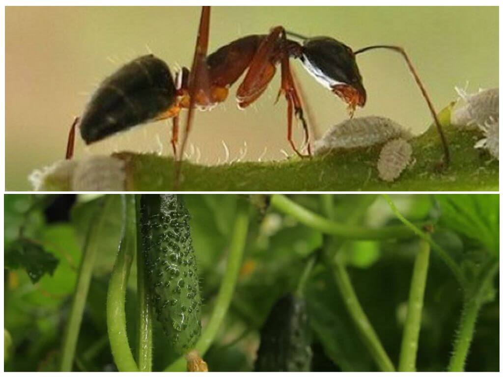 - разводят тлю на молодых листьях и побегах растения, личинки и взрослые особи этого насекомого ослабляют иммунитет огурцов, повреждают бутоны, разносят инфекцию;