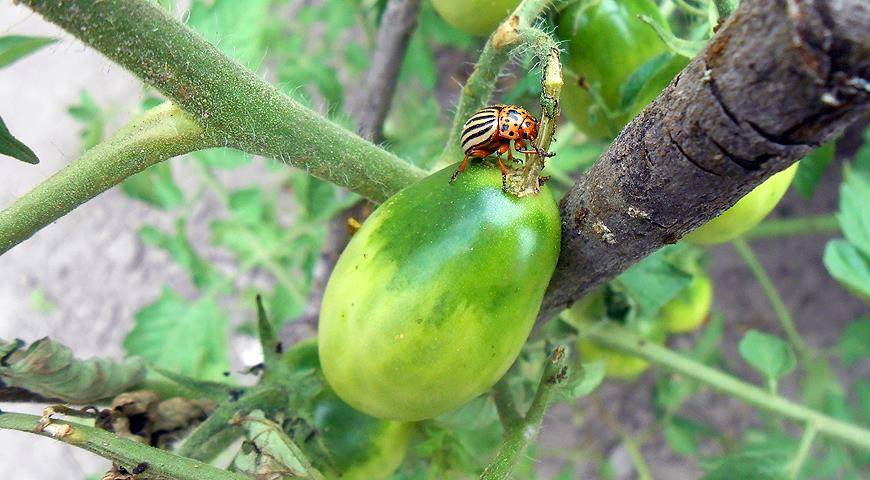Питается томатами, баклажанами, изредка табаком, а из дикорастущих растений – пасленом. Колорадский жук прожорлив, объедает ботву, начиная с верхних листьев, и не успокаивается, пока от растения не останутся только стебли. Жуки могут перелетать на десятки километров.