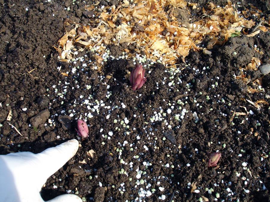 Удобрения вносят очень аккуратно, чтобы не повредить луковицы. Почву рыхлят сверху. Перекопка проводится на глубину 35-40 см.
