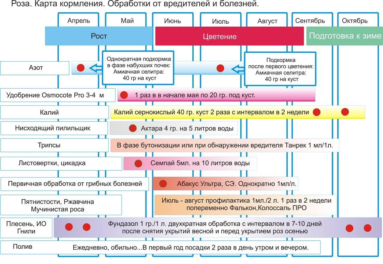 Растение следует подкармливать в весенний и летний сезон, поскольку в это время розы активно растут и им необходимо большое количество питательных веществ. Последняя подкормка проводится в последних числах июля. Осенью розы не подкармливают, чтобы растение не росло дальше, а молодые побеги успели одеревенеть до заморозков и не замерзли зимой. В зимнее время подкормка также не проводится.