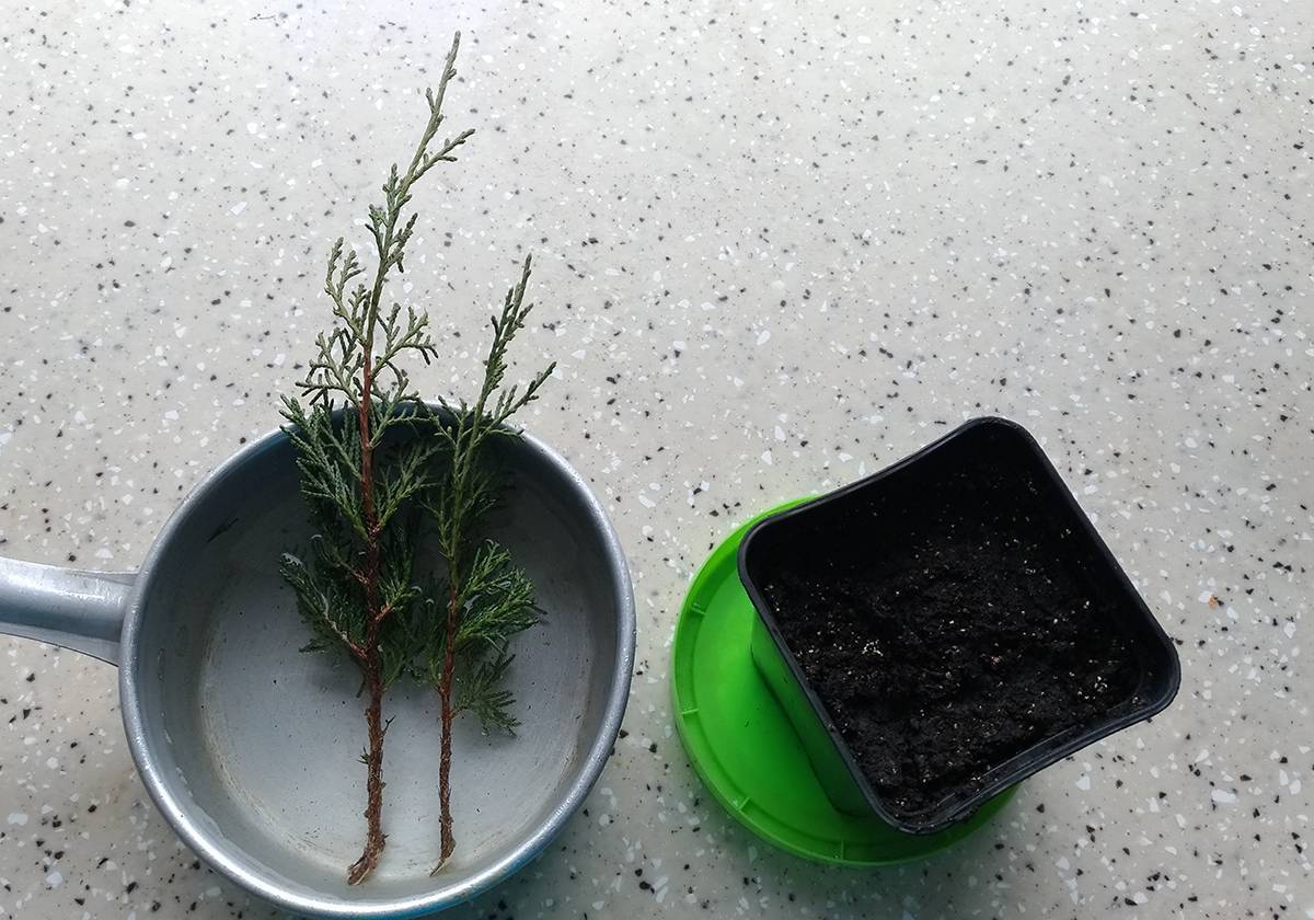 Картошку с туей помещают в ящики и присыпают почвой. Сверху конструкцию накрывают тепличкой или пластиковыми бутылками. Регулярно черенки проветривают и поливают. Когда отводки дали молодой прирост, саженцы можно пересадить в отдельные емкости.