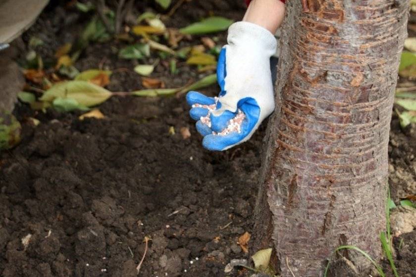 Затем черешня удобряется мочевиной через 4 года после посадки с марта по апрель месяц. В области кроны выкапываются бороздки 30 сантиметровой шириной и глубиной. Насыпают туда 200 грамм мочевины и заливают двумя вёдрами воды. В месяце сентябре саженец подкармливается 300 граммами суперфосфата и 100 граммами сернокислого калия.