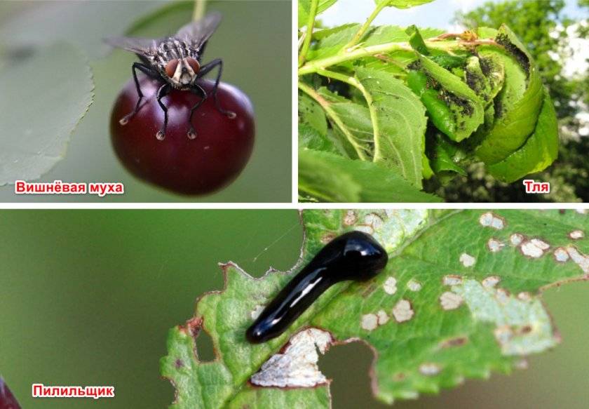Еще одной проблемой при выращивании черешни становится нападение вредителей: тли, вишневой мухи, пяденицы, трубковерта. Против них применяют инсектициды Искра, Актеллик, Конфидор или народные средства: табачную пыль, древесную золу, настой полыни. Хорошая профилактика против вредителей – перекапывание почвы под черешней, регулярная обрезка, уборка и сжигание опавшей листвы.