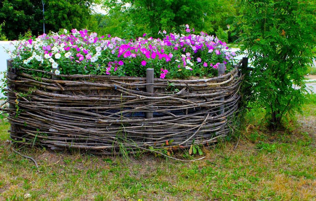 Чтобы оформить свою клумбу в индивидуальном стиле, возведите для нее декоративное плетеное ограждение из веток ивы и лозы