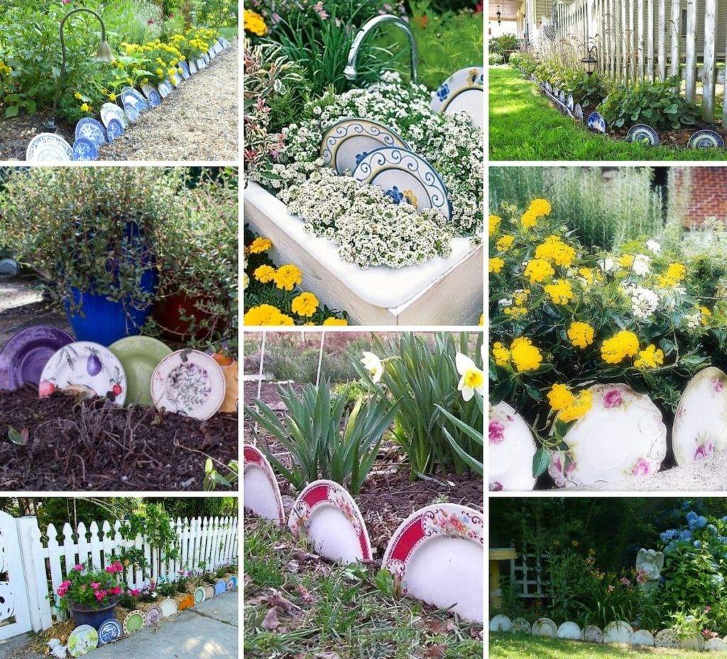 Пластиковые и стеклянные бутылки – не единственные подручные материалы, которые можно использовать для изготовления практичных и недорогих ограждающих конструкций для палисадника. В качестве обрамления зачастую используются старые плоские тарелки. Они наполовину вкапываются в грунт, тщательно утрамбовываются и становятся надежной защитой садовых растений от разрастания. Особенность такого забора заключается в вариативности форм и размеров. Да и сам заборчик выглядит необычно, если использовать тарелки разного размера. При этом глиняная или керамическая посуда легко поддается окрашиванию. Разнообразить композицию помогут чашки, блюдца, лодки.