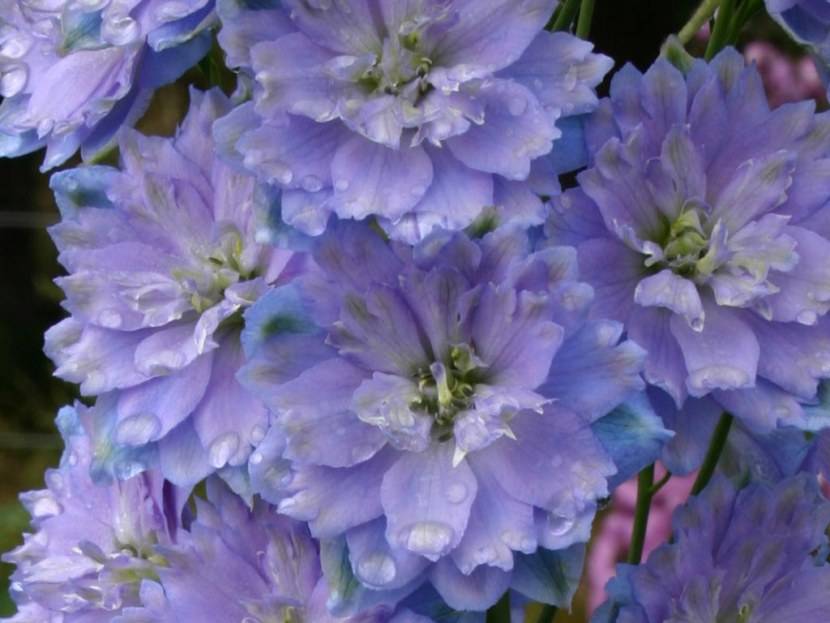 Дефиле. Представляет собой дельфиниум Дефиле однолетнее ветвящееся растение высотой до 1,5 метра. Листовая пластина сильно рассечена, находится на коротких черешках. Соцветия махровые, крупные, их диаметр составляет 5 сантиметров. Встречаются голубые, фиолетовые, розовые, белые, красные и сиреневые экземпляры.
