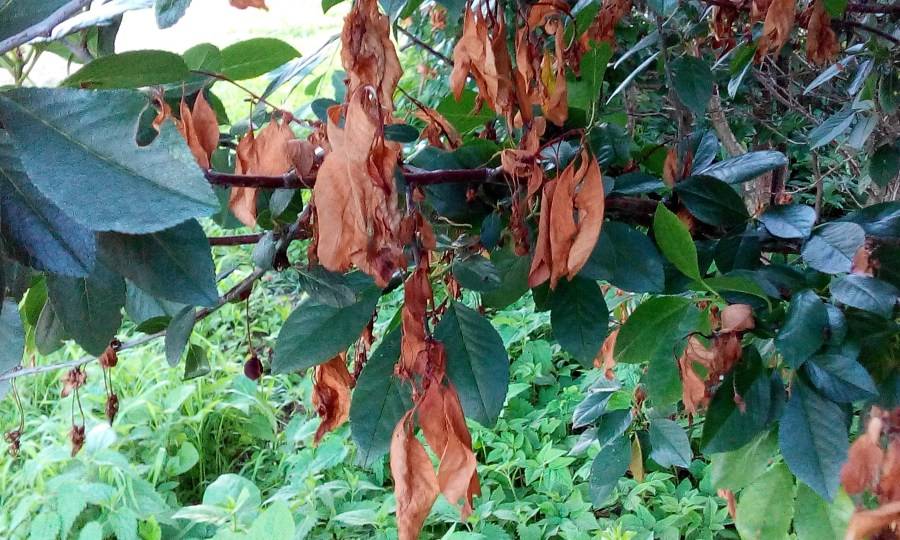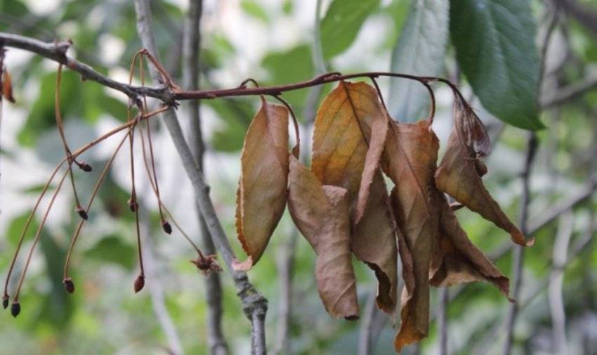 Ещё одним заболеванием, которое приводит к отсутствию плодов, является монилиальный ожог. Это грибковое заболевание поражает завязь и приводит к ее опадению. Признаками этой болезни является усыхание листвы, появление ожогов на побегах, а также бурых пятен на коре.