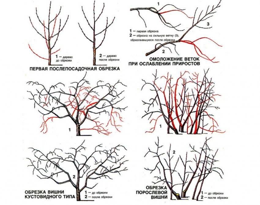 Слишком густая, ни разу не обрезанная крона вишни, является причиной низкой урожайности, мельчания плодов. В то же время, обрезку надо делать со знанием дела. Некоторые неопытные садоводы обрезают букетные почки, которые располагаются на двух- или трёхлетнем приросте, и могут плодоносить до 7 лет. Нельзя срезать однолетние побеги, которые принесут плоды в следующем году. Вишнёвое дерево не следует обрезать больше,чем на треть всей древесины.