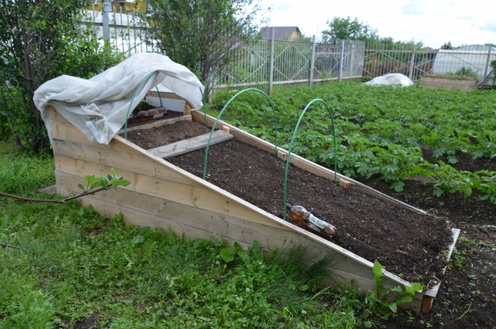 Тёплая грядка имитирует склон, обращённый на юг; застой воды исключён, сверху накрывается агроволокном, тёмные бутылки с водой служат аккумуляторами тепла