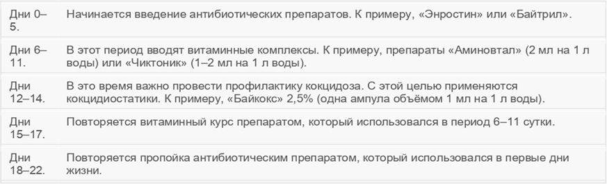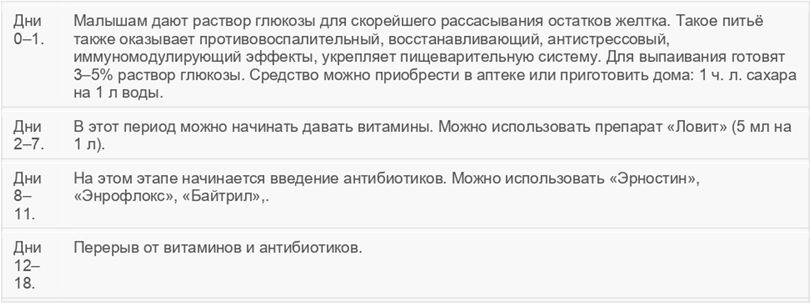 Но есть и другое мнение: в первые дни после появления птенцов на свет антибиотики применять нельзя: это вредит здоровью птиц. Схема пропойки следующая: