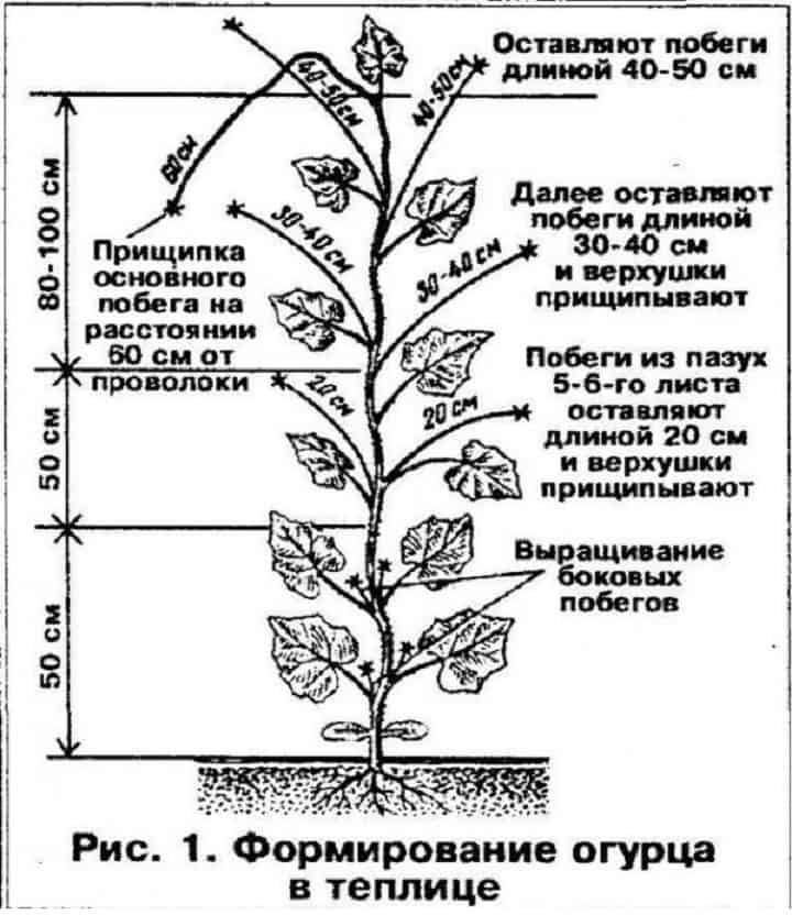 Схема формирования огурцов в теплице с образованием одного стебля методом подвязывания: