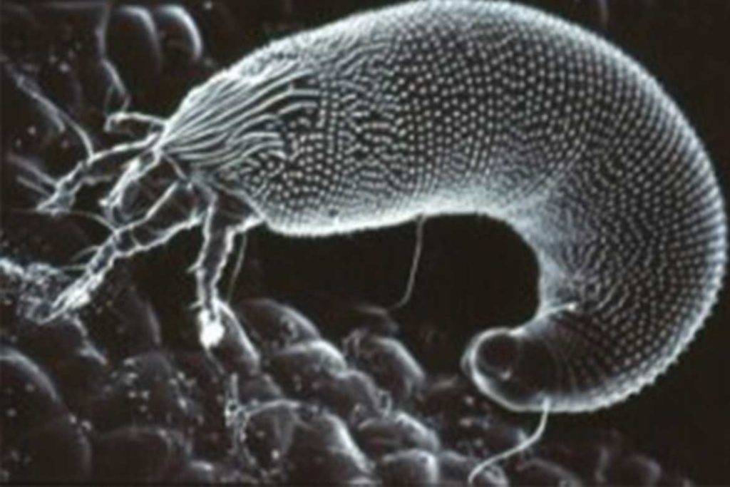 Галловый клещ, или зудень, – мелкое сосущее насекомое, длина взрослой особи составляет всего 0,3 мм, поэтому увидеть его невооруженным глазом невозможно. Тело клеща удлиненной, червеобразной формы с двумя парами лапок. Ротовой аппарат представляет собой колющий хоботок. С помощью хоботка он прокалывает сочный лист груши, высасывая из него питательный сок.