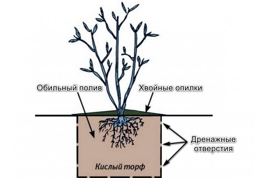 Голубика очень требовательна к кислотности почвы, и культура не будет хорошо расти и плодоносить, если посадить растение в неправильный тип почвы. PH грунта должен быть 5,5 или ниже. Чтобы увеличить кислотность субстрата, при посадке необходимо: