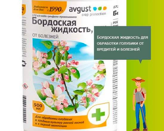 Денис Блю – голубика с сильной иммунной системой, но обработку от гусениц и прочих вредителей провести следует. Так первую процедуру делают весной в качестве профилактики (до сокодвижения). Лучше приобрести бордоскую смесь.