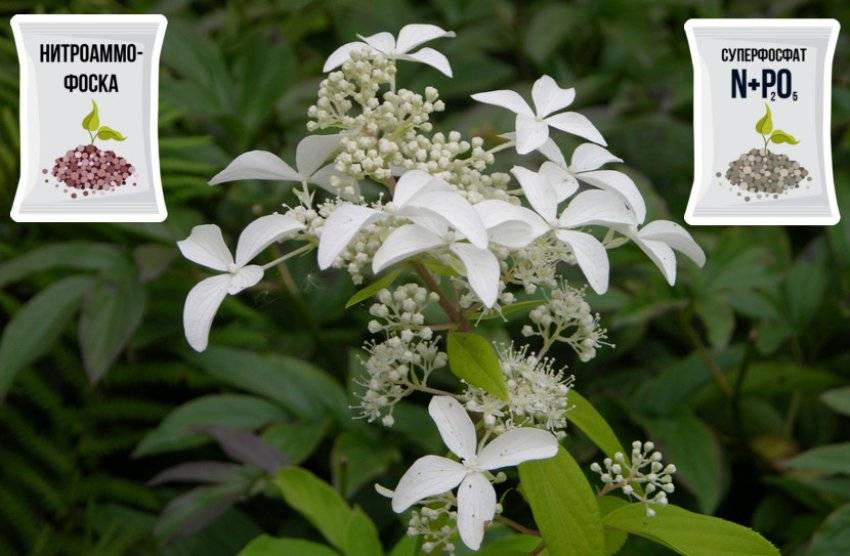 - во время набора цвета. Гортензии нужны калий и фосфор. Необходимо добавить по 20 г сернокислого калия и мочевины, 60 г суперфосфата под каждый куст;