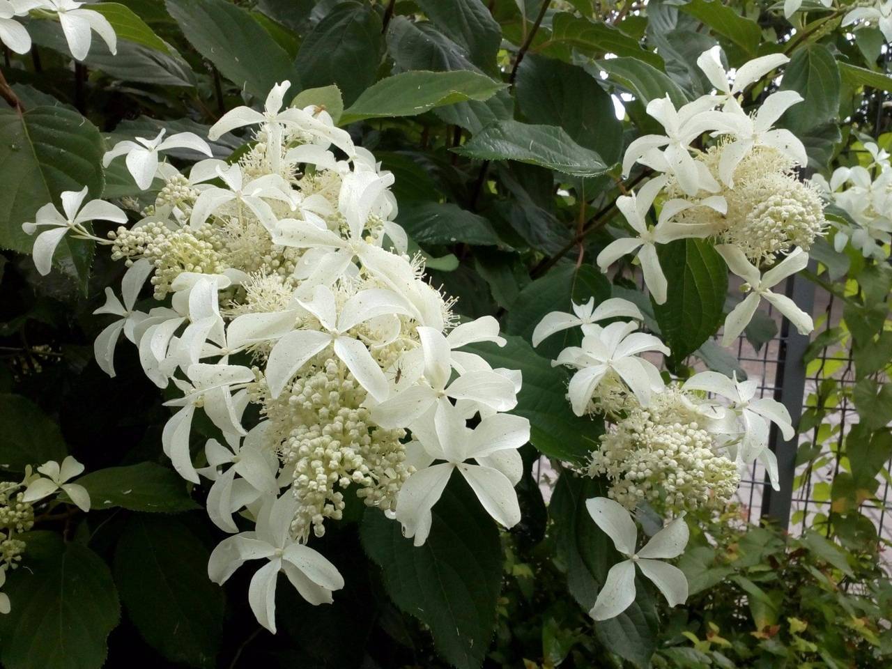 Лиановидные побеги гортензии черешковой стелятся по земле, а будучи поднятыми на опору, украсят любую вертикальную поверхность – арку, трельяж, беседку. Темно-зеленые листья, длиной до 10 см, широко-округлые, глянцевые, сердцевидно заострены. В июне побеги украшают нежно-розовые или белоснежные цветки, наполняющие рыхлые соцветия-щитки до 25 см диаметром.
