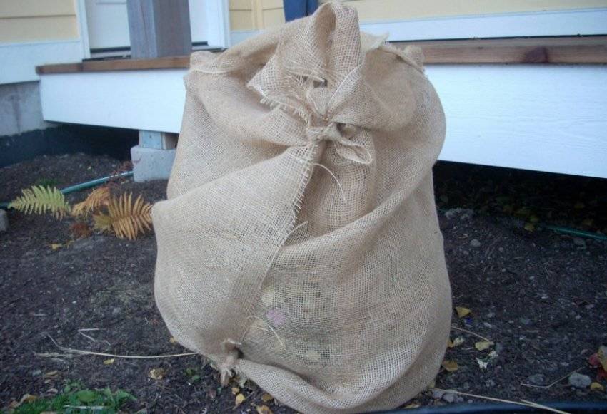 Веточки связывают, затем пригибают к земле, укрывают мешковиной или еловым лапником. Под дышащим материалом они не запреют и не вымерзнут за зиму.