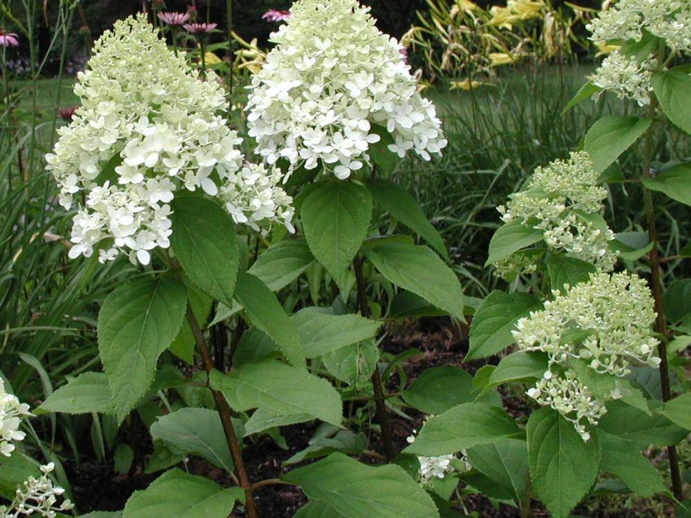 Pee Wee (Пи Ви) – уникальная и компактная форма гортензии “Grandiflora”. Обрезка привела к большим различиям между тремя растениями; первое сильно обрезанное было довольно невзрачным, второе обрезалось меньше, дало много новых побегов, третье необрезанное растение было лучшим. Однако плотные метелки на сильно обрезанном растении полегают.
