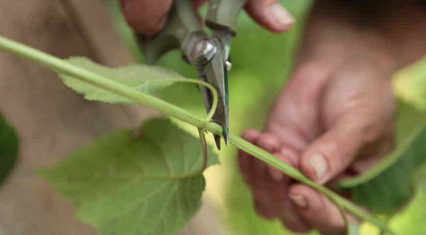 Для заготовки черенков рекомендуется использовать прикорневые побеги. Длина отрезка должна быть 70–80 мм, при этом на нем может быть до 3 междоузлий. Удалите все листовые пластины с нижней части отрезка. А листья в верхней его части укорачивают на ½ часть, если они крупные, и на 1/3 ― если небольшие.