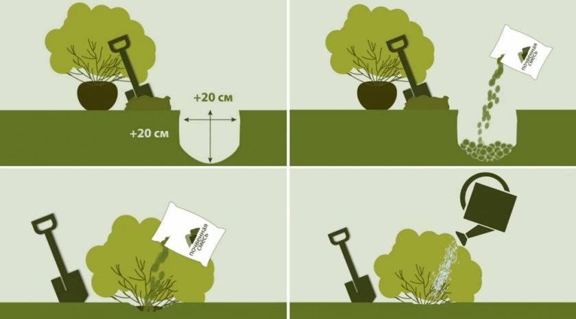 - Размеры средней посадочной лунки должны соответствовать 50 см в диаметре и не менее 40 см в глубину, хотя при использовании саженца с закрытой корневой системой стоит ориентироваться на размеры уже имеющегося в контейнере земляного кома (в этом случае глубина ямы для посадки должна быть на 10–15 см глубже нижней части саженца).