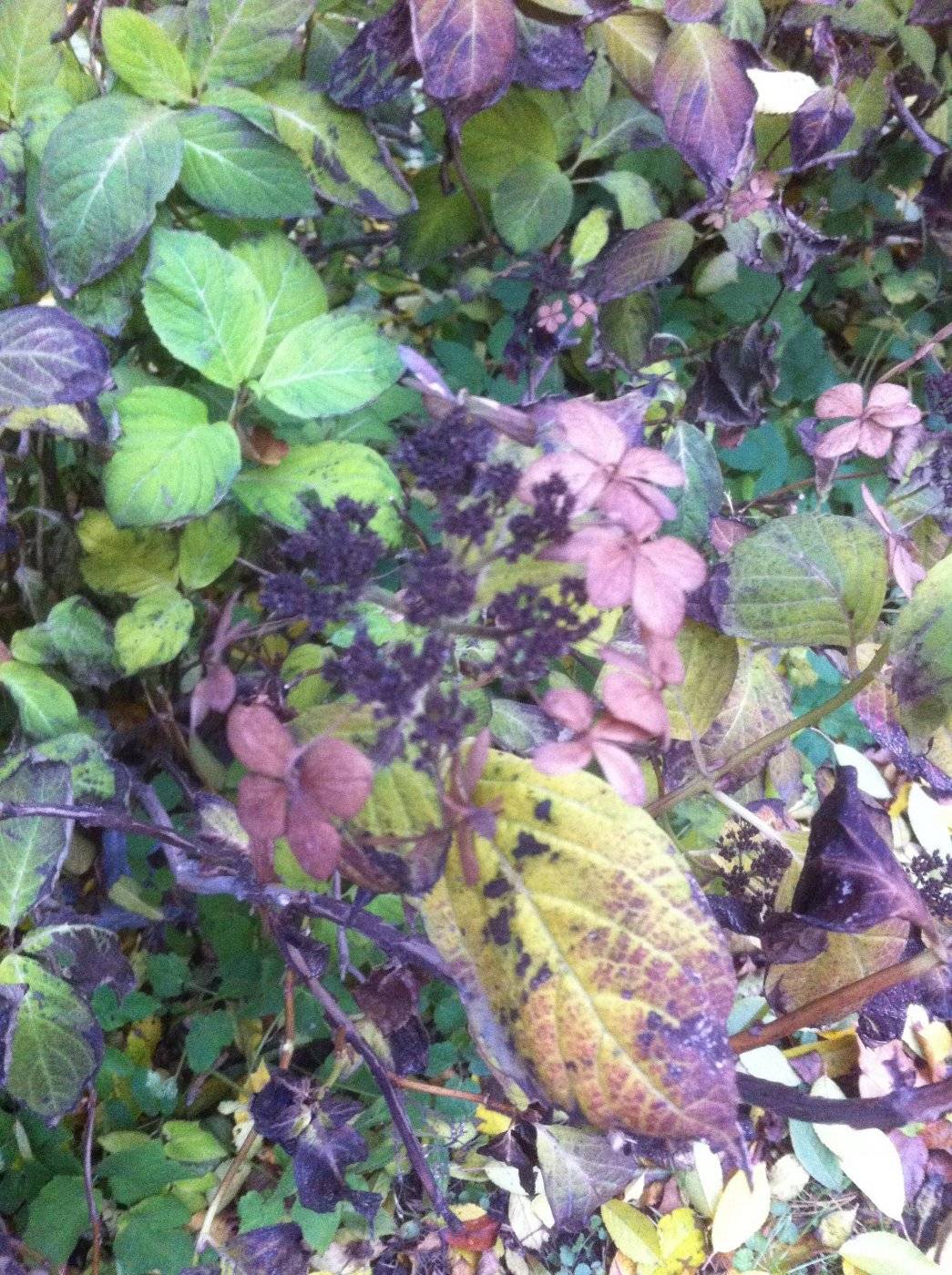 Листья пильчатой гортензии приобретают осенью просто удивительные оттенки