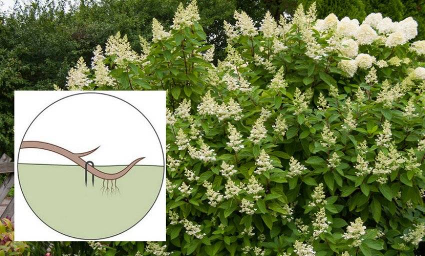 В начале весны, пока не распустились почки, возле куста выкапывают канавки глубиной несколько сантиметров. В них прикапывают выбранные нижние ветви так, чтобы верхушки остались наверху. Побеги пришпиливают к почке.