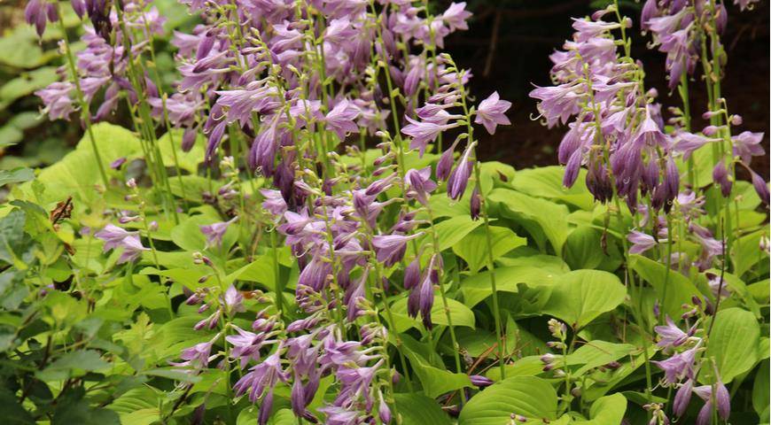 Летом (июле-августе) хоста выпускает воронковидные, колокольчатые цветы белого, фиолетового оттенков.