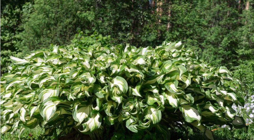 Хоста волнистая отличается оригинальными волнистыми двухцветными листьями с загнутыми кончиками. Воронковидные цветы светло-фиолетового цвета растут на длинном стебле.