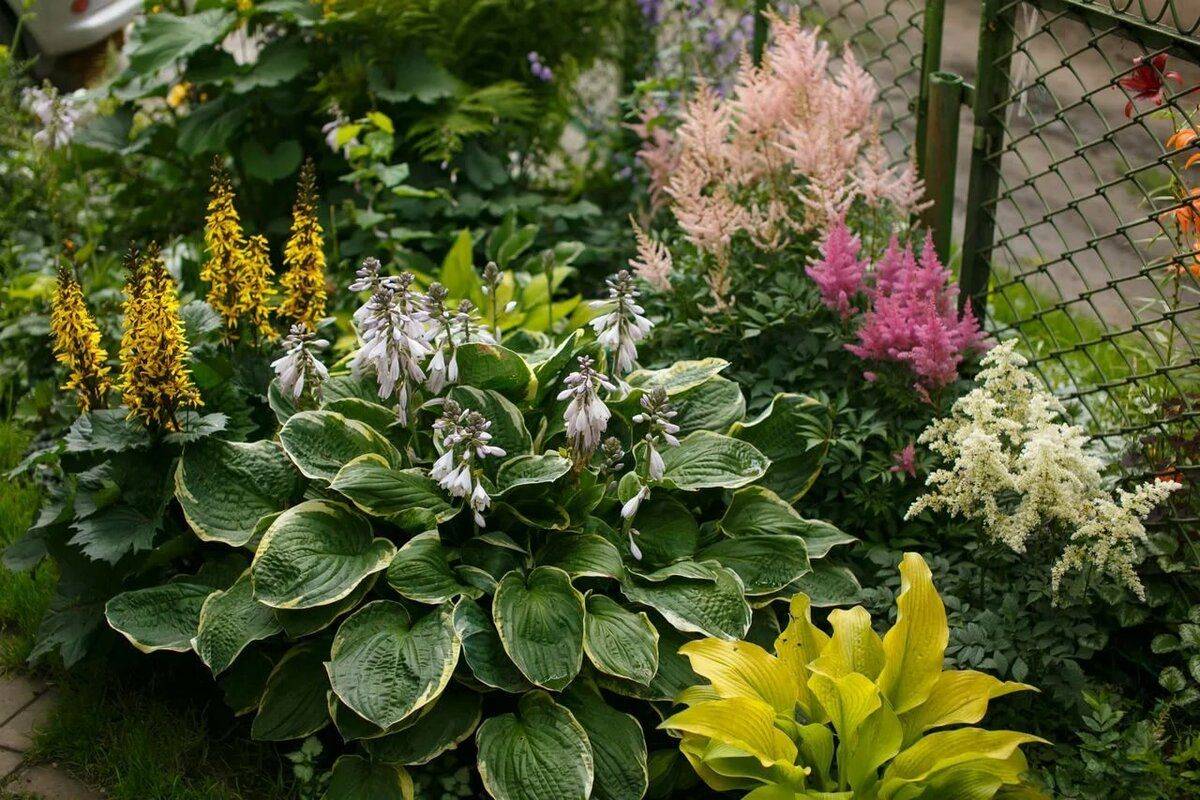 Создать яркий цветник можно и с другими растениями. К примеру, астильба со своим невероятно пышным и ароматным цветением определенно станет одним из самых подходящих вариантов. Только представьте, насколько прекрасно будут смотреться пышные, яркие кусты хосты в сочетании со столь прекрасными соцветиями. Такая композиция однозначно украсит ваш сад или приусадебную территорию. Кстати очень часто ее обрамляют каменной кладкой, что делает композицию еще более привлекательной.