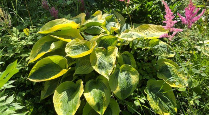 Гигантские хосты – огромные фокусные точки, независимо от того, высажены они в одиночку в качестве коллекционного образца или массовкой для покрытия большой площади. Хосты Key West и Sum and Substance могут стать отличным фокусом в более солнечном месте. У них ярко-желтая листва, которая будет отличным акцентом на окружающем зеленом фоне.