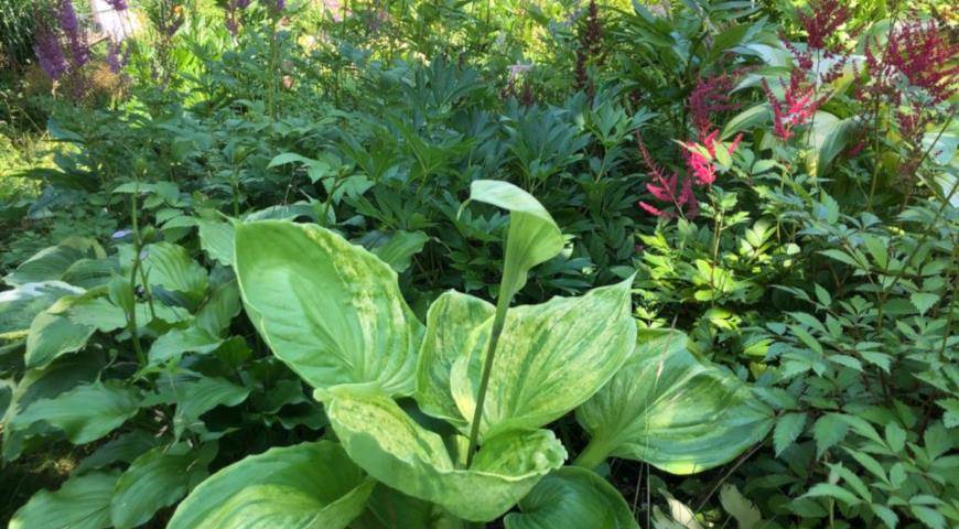 При выборе гибридных хост обращают внимание на сроки цветения и степень теневыносливости. Яркий представитель – хоста Белые Перья, или белая