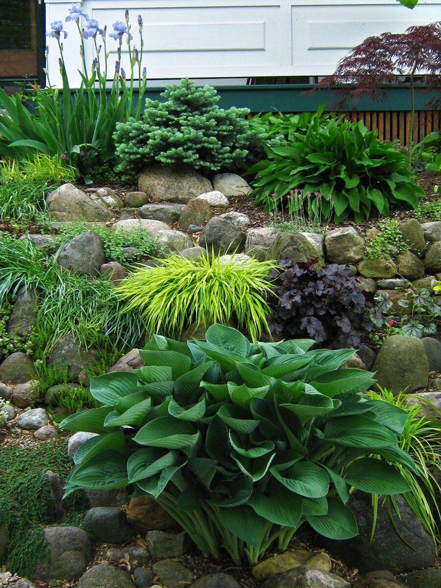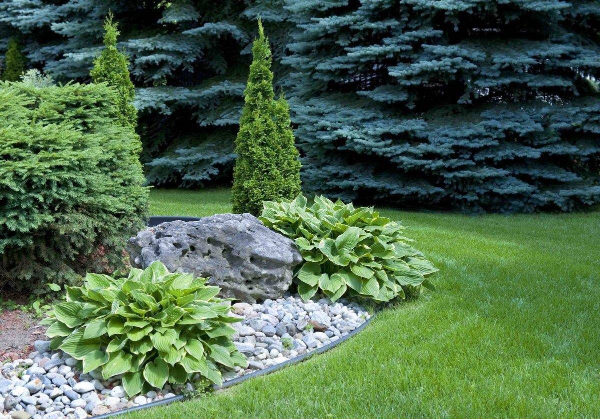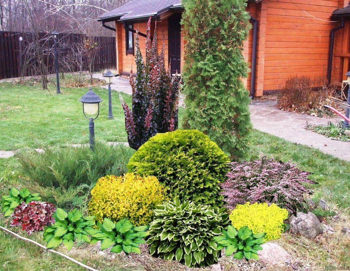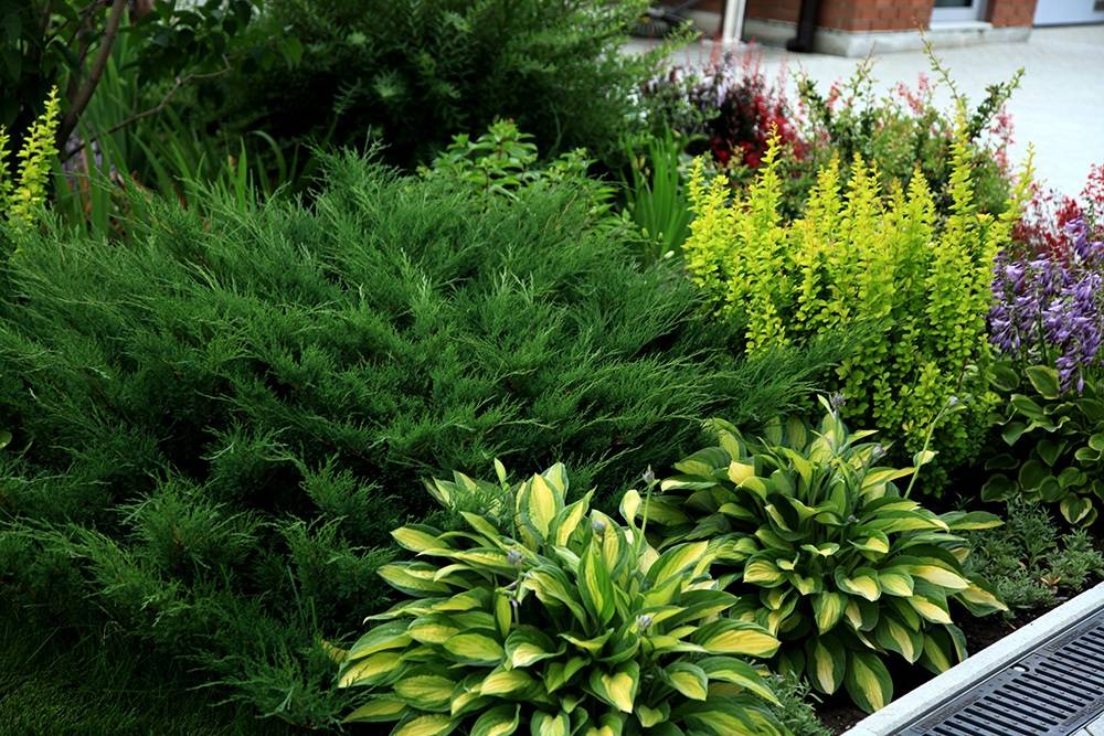 При создании ландшафтной клумбы важно знать, что можно посадить между хостами разные виды хвойников. Отлично будут смотреться и уживаться с туей и можжевельником