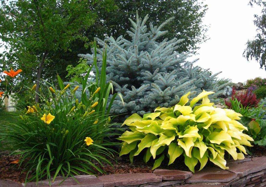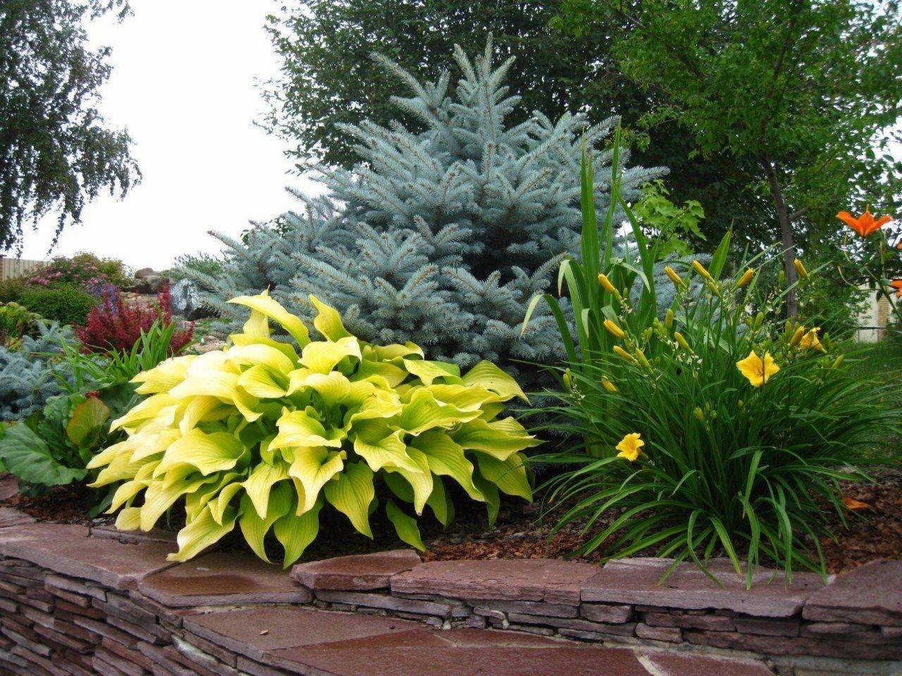 В центре композиции из хост можно посадить декоративную голубую ель. Выбирать стоит культуры с темными или светлыми листьями.