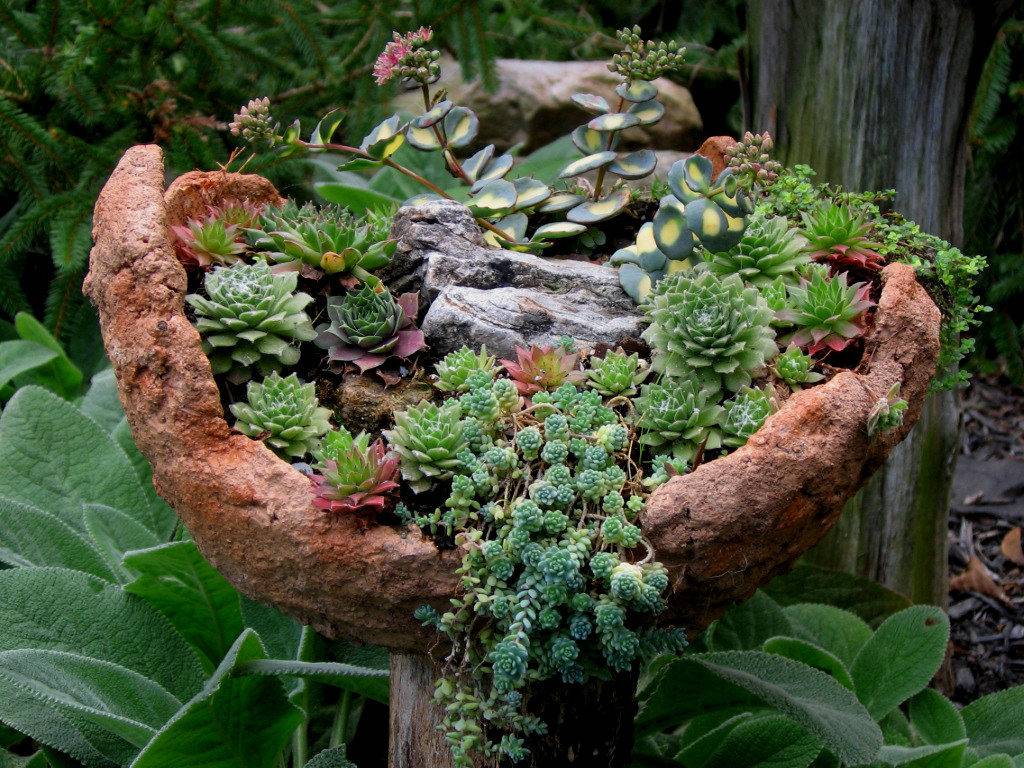 Можно разбавить дикую флору горшечными цветами: посадить их в вазоны, гармонирующие с каменистой основой. В этом случае тоже нужно следить, чтобы освещенность соответствовала природным потребностям растения.