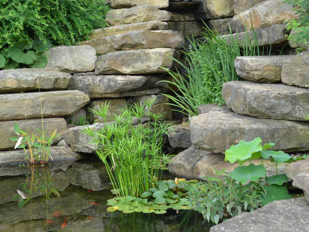 Хорошо смотрятся ракушечник, туф, песчаник. Но у них высокая пористость, а значит, низкая долговечность: в процессе замерзания/оттайки разрушается структура камня. Можно использовать лесной валун, а для горки с прудом – гальку. В качестве вкраплений подойдут яшма и кварц. Пестрота нежелательна, одна-две породы, не больше.
